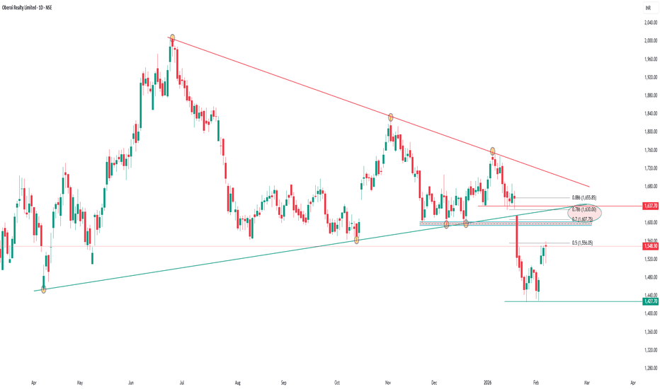 OBEROI REALTY – Pullback into Supply (Daily TF)After a prolonged consolidation, price formed a liquidity build-up and delivered a strong bearish displacement, confirming a clear market structure shift. (MSS)