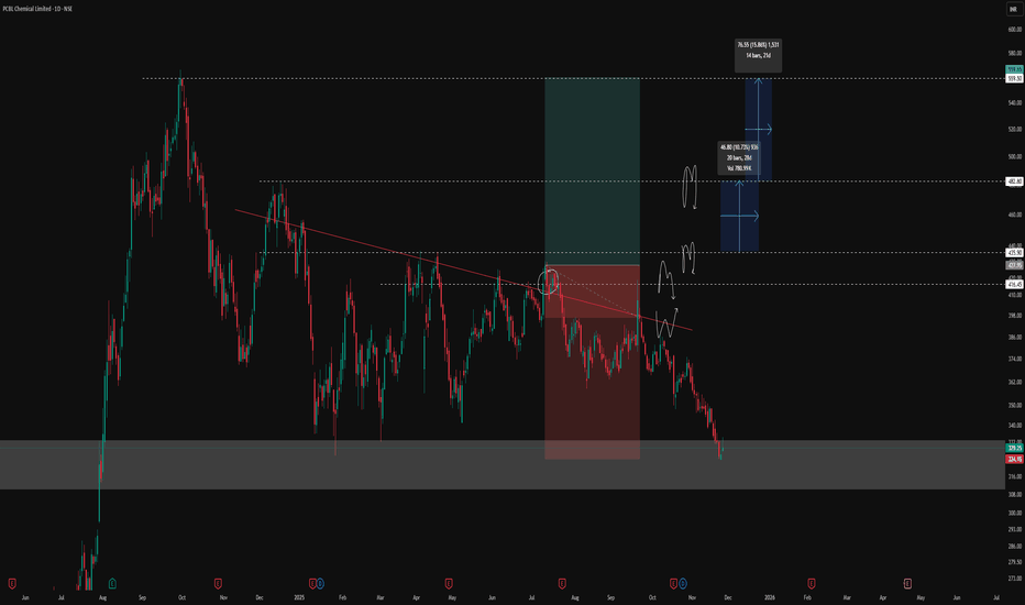 PCBL: Reversal Structure and Key LevelsThe stock of PCBL has experienced a significant decline from the ₹437 level, followed by a notable recovery from a major support zone, often referred to by traders as a discount or value area. Recent price behaviour indicates the possibility of a trend reversal supported by multiple technical fa