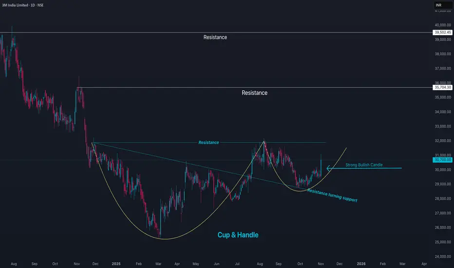 3M India Limited (3MINDIA) is currently trading around ₹30,865, marking a strong 4.4% rise in the latest session. The stock has a 52-week high near ₹37,133 and a low around ₹25,718, placing it closer to the upper end of its annual range. The market capitalization is approximately ₹33,300 crore.