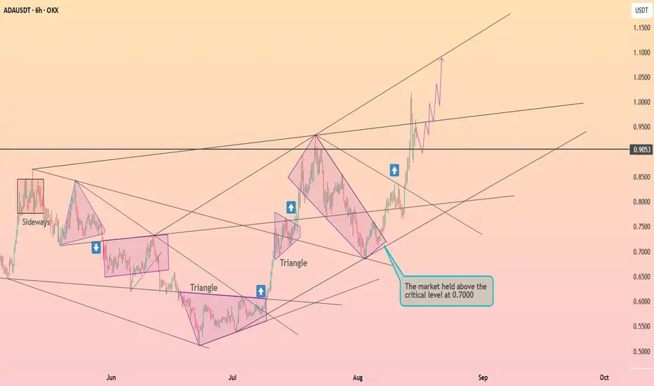ADAUSDT has broken above $0.90 resistance after consolidating in triangle and sideways structures. This breakout sets the stage for a move toward $1.05–$1.10, with strong bullish momentum as long as $0.90 holds.