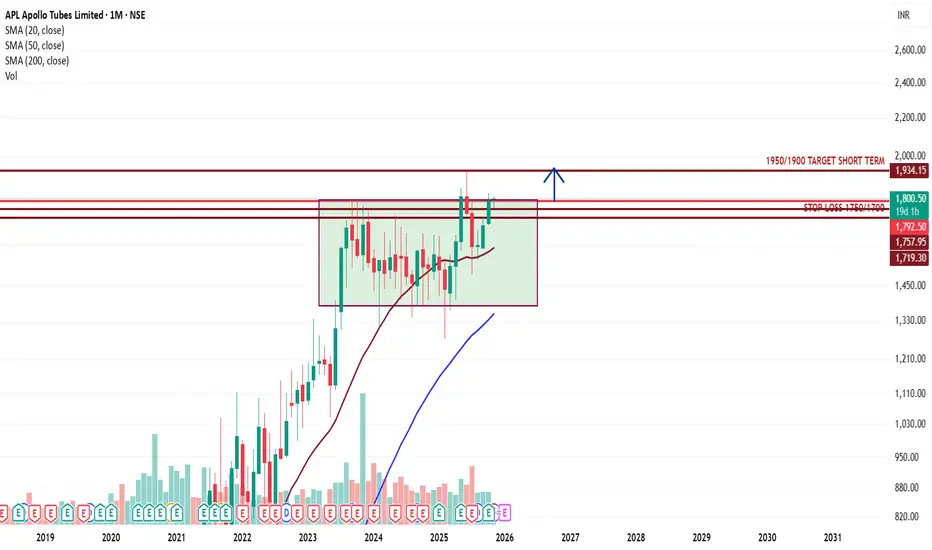 Apl Apollo tubes strong monthly consolidation from 2023 and high possibility to breakout of 1800 resistance and consecutive monthly closing from the previous month and weekly also. If the weekly close above 1800 then it will go up upto 2400. short term target is 1950