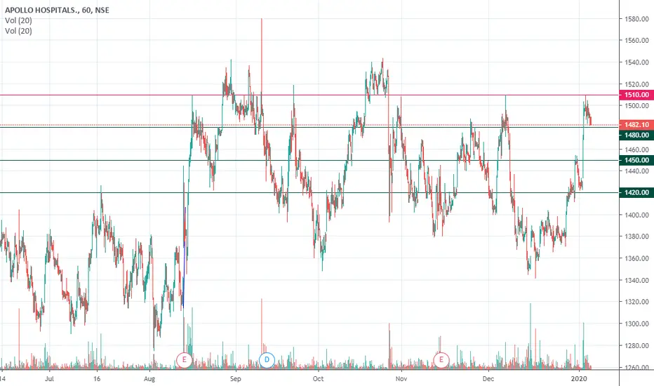APOLLO HOSPITAL LTD: AFTER FORMING BASE BUILDING FORMATION. THIS SCRIPT SHOWN MAJOR UPTREND IN LAST SESSION WITH HEAVY VOLUMES, BEARISH REVERSAL CAN BE SEEN FROM TOP, FORMING INDECISON CANDLE ON THE TOP OF THE CHART, RSI IS IN OVERBOUGHT ZONE OF 70, SO WE ADVISE TO SELL IT BELOW 1480 TGT 1450-1420 SL ABOVE 1510.