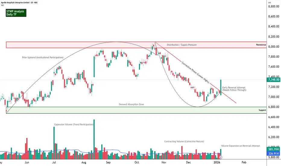 APOLLOHOSP has been in a corrective phase after a prior uptrend, trading within a descending structure marked by a clear trendline connecting lower highs. Price recently reacted strongly from a long-term support zone near the lower boundary of the range, forming a decisive bullish candle that signals demand absorption at lower levels. While the broader structure still carries corrective characteristics, the recent move reflects an early attempt at reversal and mean reversion, with price pushing back toward the mid-range as it approaches the declining supply line and overhead resistance zone.