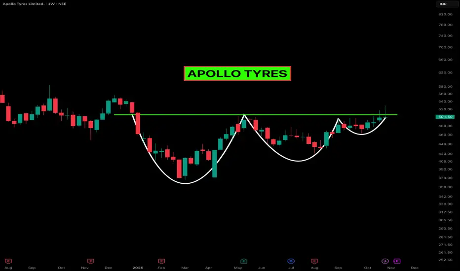 Apollo Tyres is showing some serious strength on the weekly chart. After months of squeezing inside a clean Volatility Contraction Pattern (VCP), the stock has finally started to break above the neckline zone around ₹500–₹520 — a level that’s acted as a ceiling multiple times in the past.