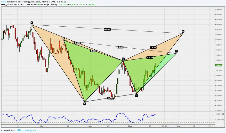 We have spotted bearish gartley and bearish bat on ASHOKLEY chart. Let's wait and see which one gives us profit.