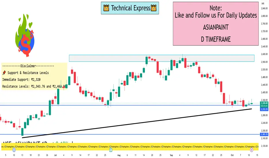 Asian Paints Ltd. is currently in a bearish phase on the 1-day timeframe. Key support at ₹2,320 is crucial; a breach could lead to further declines. Conversely, a rebound above ₹2,463.98 might indicate a potential trend reversal.