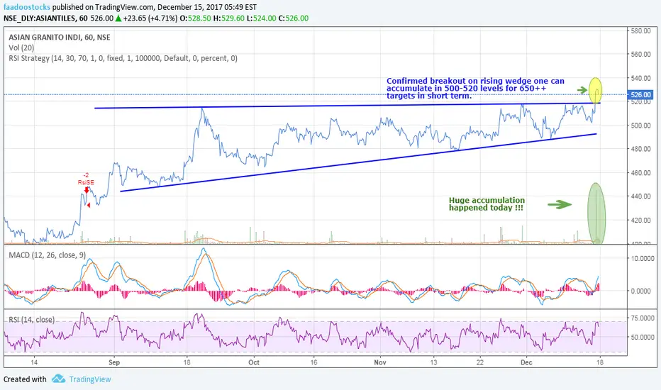 Confirmed breakout on rising wedge one can accumulate in 500-520 levels for 650++ targets in short term.