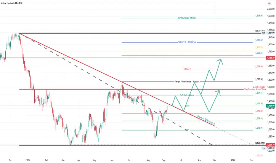 Astral Ltd has broken out of a long-term falling trendline, indicating a potential shift from bearish to bullish momentum. Price is trading above the safe entry level of ₹1,453 and holding strong. Sustaining above ₹1,514 may confirm further upside targets.