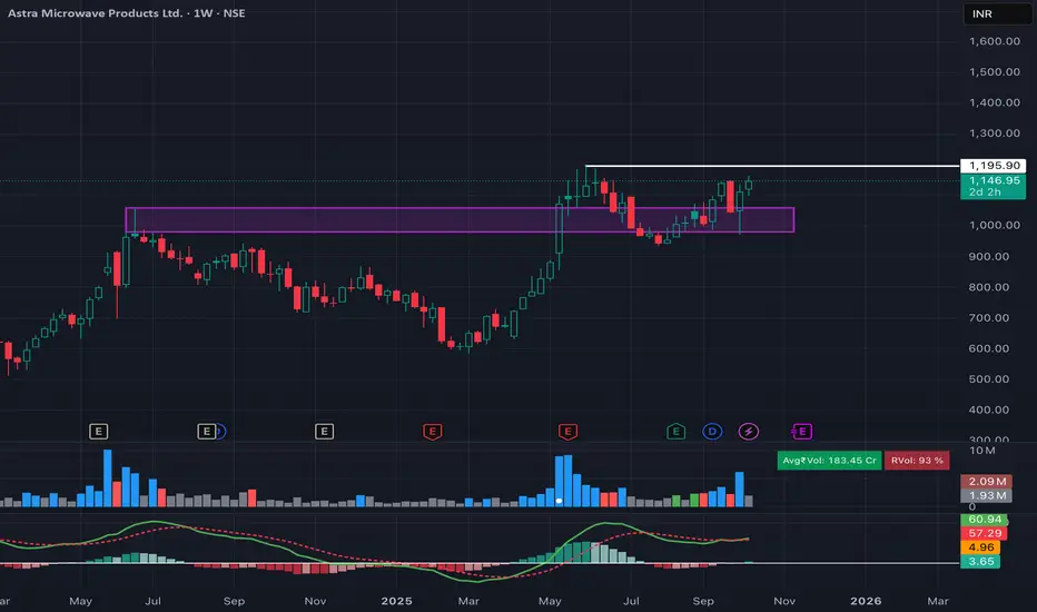 Astra Microwave is attempting a breakout above the 1,180–1,200 resistance zone on the weekly chart after consolidating for several weeks. The structure shows strong base formation and higher lows, signaling accumulation before a potential move higher.