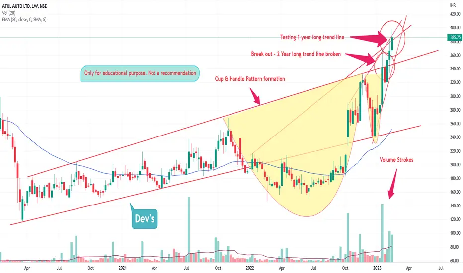 Manufatures of 3 wheeler and their engines, a zero promoter pledge stock with a turn around history. Stock is near 52 week high with significant volume strokes . Recovery 5 from 52 week low is also so good. Now broken multi year trnd line . A cup and handle formation baked in the chart. Can cross 400 levels soon and 450 is not so far . Multibagger scope in long run