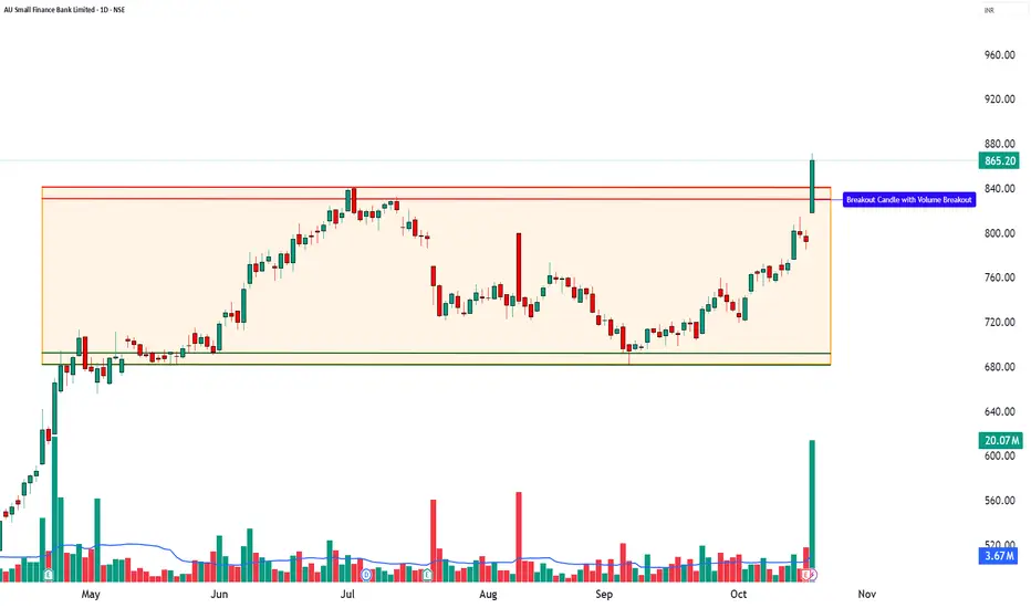 For months, AUBANK was moving sideways between ₹680 and ₹840. Now, it has broken above ₹840 with heavy volume, showing that the stock has ended its consolidation phase and started a new bullish trend. This breakout shows that buyers are taking charge, and if the volume remains high, the stock may continue to move upward in the coming sessions.