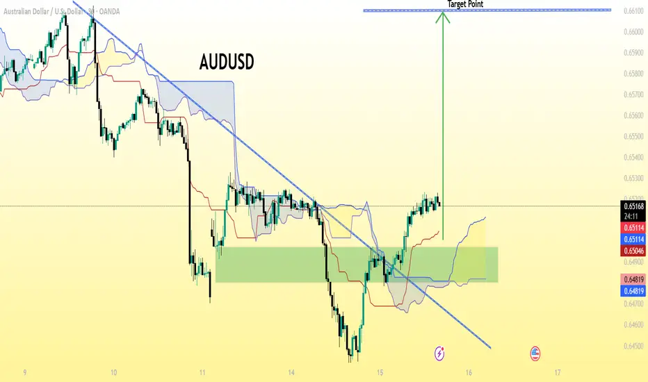 This setup seems to be a breakout + retest trade idea where the expectation is that AUD/USD will move upward about 80–100 pips toward the 0.6600 target area.