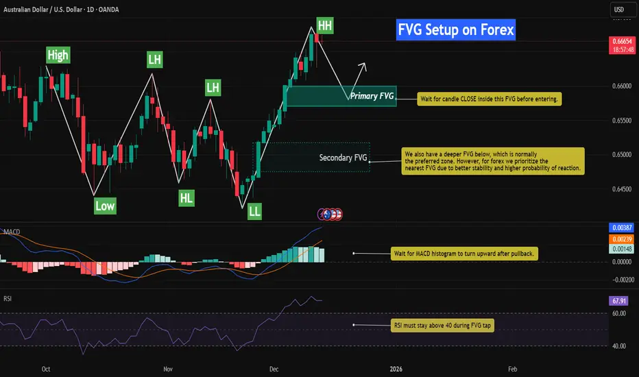📈 AUDUSD – Bullish FVG Retracement With RSI & MACD Momentum Confluence