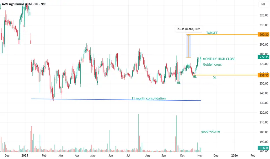 AWL HL, HL structure, 1 Weekly and 1 monthly highest closing, golden cross, buy for target with stoploss as mentioned.
