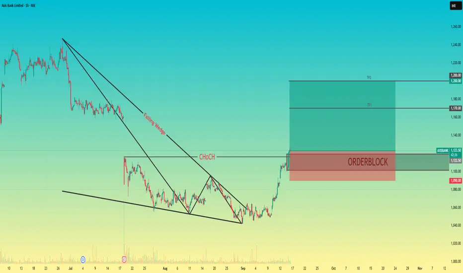 Order Block: A bullish order block has been identified around ₹1,120 – ₹1,100, which is acting as a demand zone.