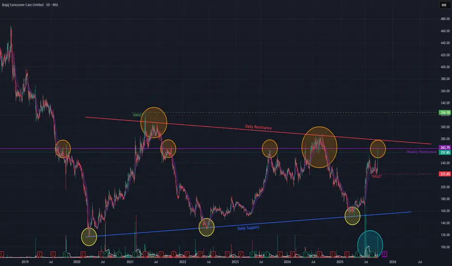 Bajaj Consumer Care is at a critical juncture following a prolonged downtrend from its January 2018 all-time high and a subsequent sideways consolidation period since March 2020. The stock recently demonstrated significant buying interest with an 8.59% surge on a high-volume spike.