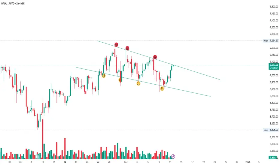 Bajaj Auto has been moving inside a falling channel on the 2-hour timeframe. Every time price hits the upper boundary, sellers push it back down, and every time it touches the lower boundary, buyers step in.