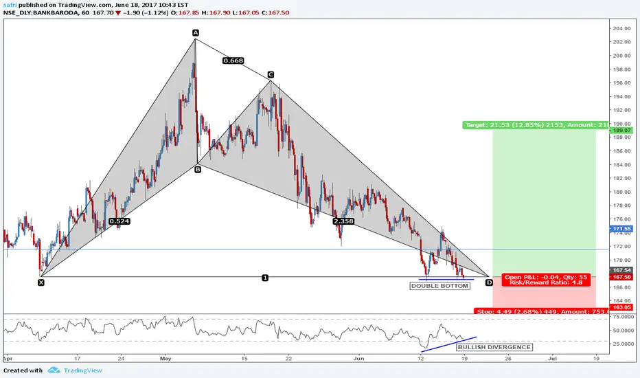 Here, we have an excellent harmonic trading opportunity on Bank of Baroda hourly chart. Bat Pattern has already completed with deep D leg completion. Price action has formed double bottom with bullish divergence on RSI. Long entry can be made @ CMP.