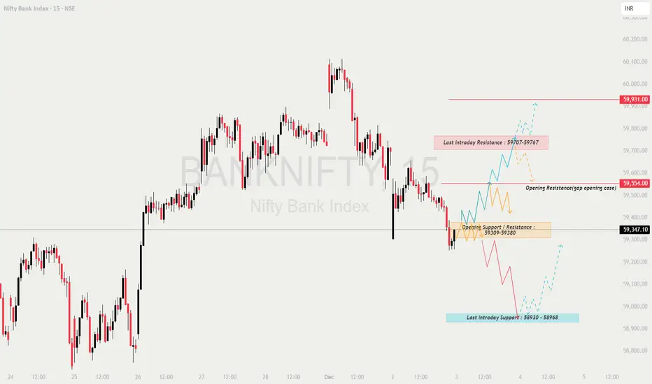 The index is currently attempting to stabilise after a sharp down-move, with both 59,554 and 58,930 acting as the most important decision zones for 03-Dec.
