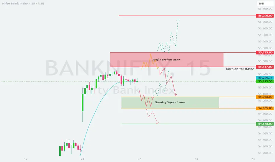 A strong gap-up opening above the Profit Booking Zone (55,735) suggests bullish sentiment. However, buyers should remain cautious as this area is ripe for profit booking or short traps.