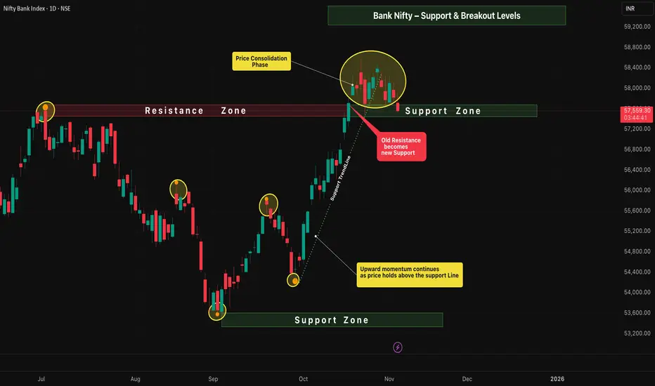 2️⃣ Consolidation Range — Price is currently consolidating between 58577.50 and 57482.05 , reflecting a balance between buyers and sellers.