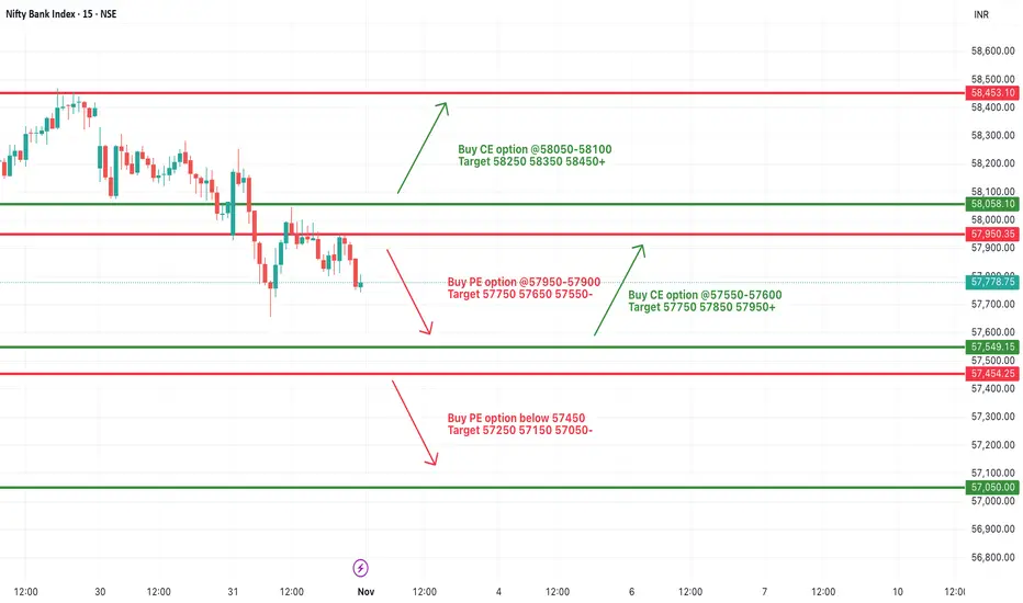 If Bank Nifty sustains above 57,800–57,850, we may see a short-covering move toward 57,950, 58,050, and 58,350+ levels. A strong breakout above 58,100 could further extend the rally toward 58,450–58,600, signaling bullish momentum.