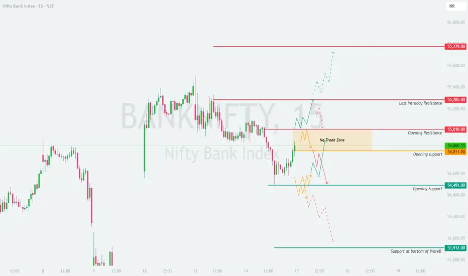 📍 Bank Nifty closed at 54,860.55 on 14-May-2025. It is currently positioned just below a critical Opening Resistance at 55,010. There are multiple confluences and potential breakout/breakdown areas around this zone. Key support is visible at 54,491, with a deeper demand zone around 53,912 (Wave B bottom).
