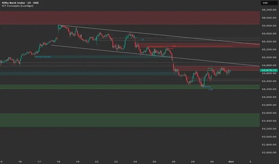 Structure: The Bank Nifty is in a sharp corrective phase, having broken the ascending channel and making lower highs and lower lows. The current price is right below the immediate resistance at 54,750 - 54,850. The strong red candle on the 4H chart indicates that the bears are dominating the longer timeframe structure.