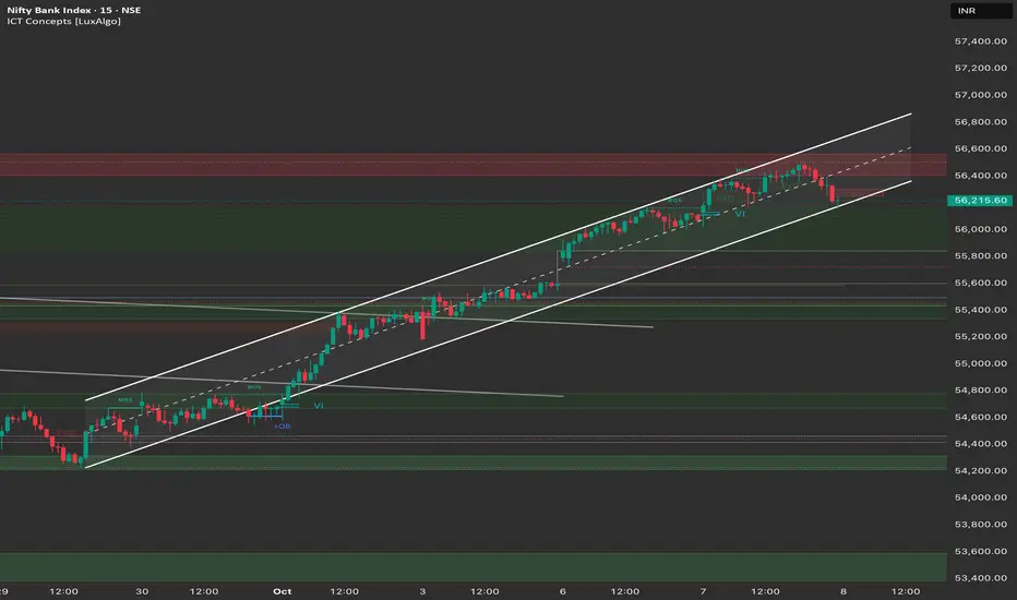 Structure: The Bank Nifty is in a strong, aggressive bullish trend and has confirmed a powerful reversal from the 54,250 base. The price is now trading within a clear ascending channel, with Monday and Tuesday's action pushing it right up to the major supply zone. The strong rejection wick on the 4H chart confirms seller activity near 56,400.