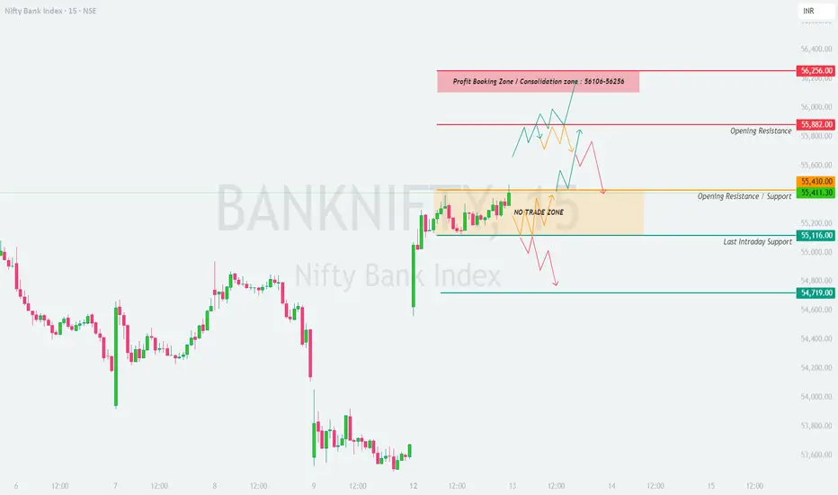Bank Nifty closed at 55,411 on 12-May-2025. Price action has formed a tight range between 55,116 and 55,430, marking this as the “No Trade Zone” unless a breakout or breakdown is confirmed.