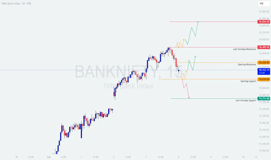 If Bank Nifty opens with a gap-up near 56,300–56,350, it will directly test the Opening Resistance zone (56,268–56,489). In such a case, avoid emotional buying at open — wait for the first 30-minute candle to confirm whether the index sustains above 56,489.
