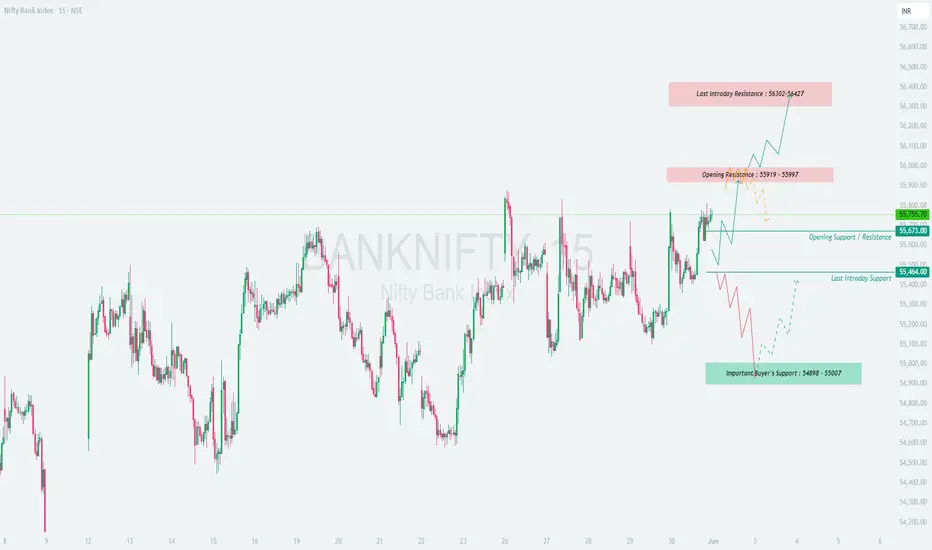 If Bank Nifty opens above the Opening Resistance zone (55,919 – 55,997), the bulls will hold an early advantage. This signals potential breakout strength, but traders must stay cautious of the Last Intraday Resistance (56,302 – 56,427).