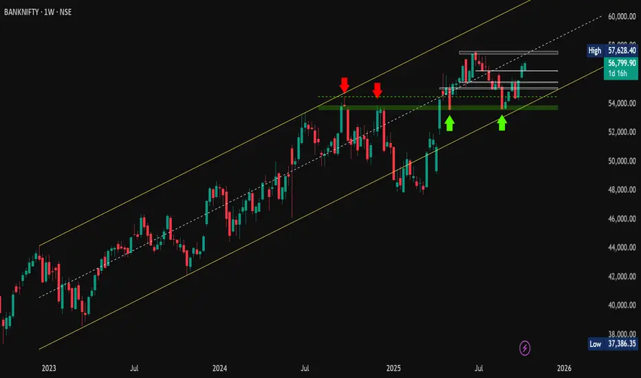 As per the updates shared on March 17 and May 15, 2025, #BankNifty continued to hold firmly above the 100-week SMA, confirming its position in the #TrendReversalZone. The index decisively broke above previous swing highs and surged to a new all-time high of 57,628.