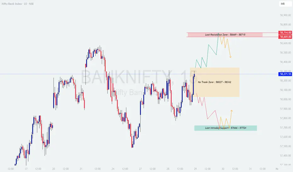 If Bank Nifty opens below 58,027, it will test the Last Intraday Support Zone (57,666 – 57,724).