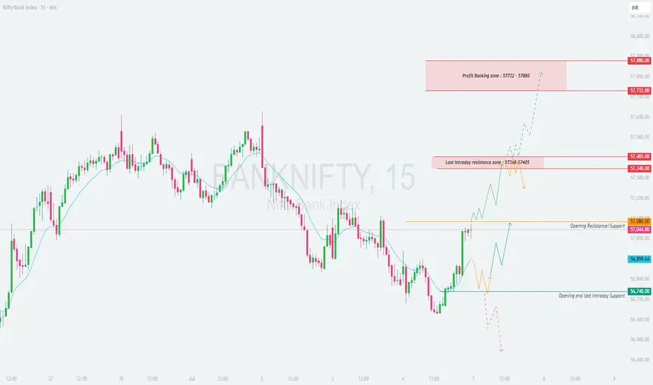 If Bank Nifty opens near or above 57,300–57,400, it will be entering the Last Intraday Resistance Zone. Wait for price to sustain above 57,405 on 15-min candle close to confirm bullish strength.