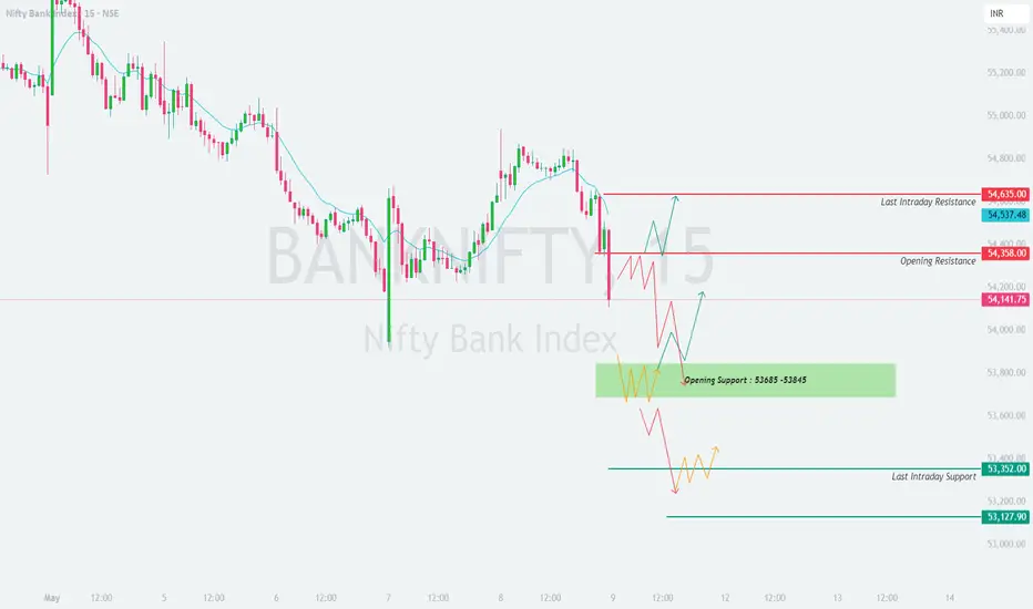 If Bank Nifty opens with a gap-up above the Opening Resistance (54,358), the index may test the next resistance at 54,635 (Last Intraday Resistance). However, since the broader structure is weak, aggressive longs should only be considered if the price sustains above 54,635 with strong volume confirmation.