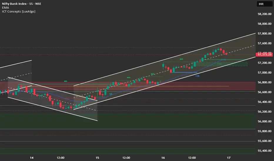 Structure: The Bank Nifty is in a high-conviction bullish trend. The price has decisively broken out above the major supply zone of 56,700 - 57,000 and is now moving aggressively toward the historical all-time high zone. The large bullish candle on the 4H chart confirms that the consolidation phase is over, and the market is in a momentum-driven rally.