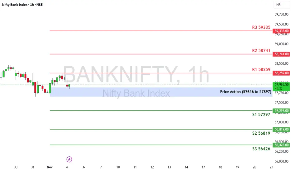 If Bank Nifty sustains above 57,897, a move toward R1 (58,259) can be expected. Sustained strength above this level may open the path toward R2 (58,741) and R3 (59,335) in the near term.