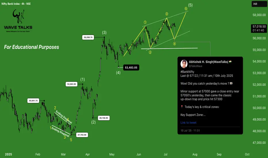 Since the bottoms of 47700, BankNifty has unfolded in a clear impulsive structure as per our previous discussions. We proposed that the 5th wave of this larger impulse is unfolding as an Ending Diagonal -a pattern known for its frustrating up-down moves that test trader patience.