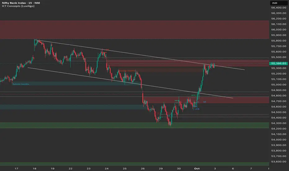 Structure: The 15M chart confirms the strong bullish momentum. The market saw a significant rally, which included taking out Sell-side Liquidity before the final surge. The price is currently consolidating just below the 55,400 resistance.