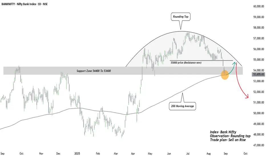 The BankNifty has recently displayed a rounded top structure, a classic sign of distribution and gradual weakness. After weeks of sideways-to-down movement, the index has now broken below the 55000 psychological mark, bringing attention to the major support zone, which also aligns with the 200-day moving average.