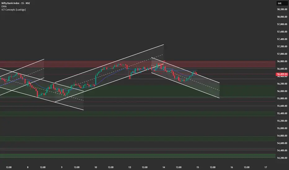 Entry: Short entry on a successful retest and rejection of the 56,300 level (upper channel resistance). Alternatively, short a decisive break and 15-minute candle close below 56,000.