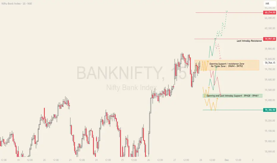 BankNifty closed near 59,764, sitting just below a very important Opening Support / Resistance Zone (59,694 – 59,792), which is also marked as a No-Trade Zone due to expected volatility.