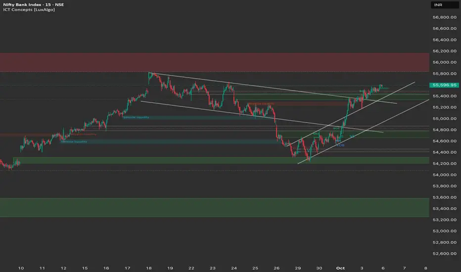 Structure: The Bank Nifty is in a confirmed bullish bounce phase. The index has decisively broken out of the steep descending channel and closed strongly above the key 55,400 level. This action signals a powerful Break of Structure (BOS), establishing a new leg up from the 54,250 demand zone.