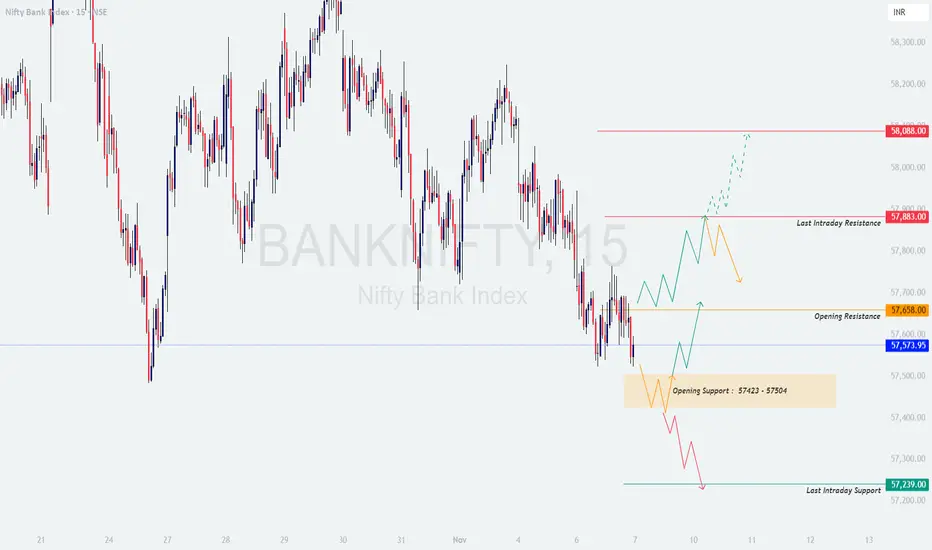 Bank Nifty is currently trading near 57,574, hovering just above its key Opening Support zone (57,423 – 57,504). The index has been consolidating after recent declines and is now positioned between two crucial areas — Opening Resistance at 57,658 and Last Intraday Resistance at 57,883.