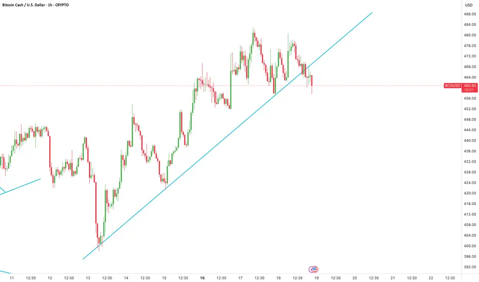 BCHUSD has broken its trendline on the 1-hour timeframe and has retested with a large doji and a subsequent inside candle.