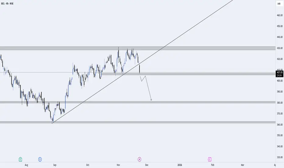 BEL has rejected strongly from the higher-timeframe supply zone around ₹425–₹430, followed by a clean trendline breakdown. This breakdown signals weakening bullish momentum and opens the door for a deeper correction.