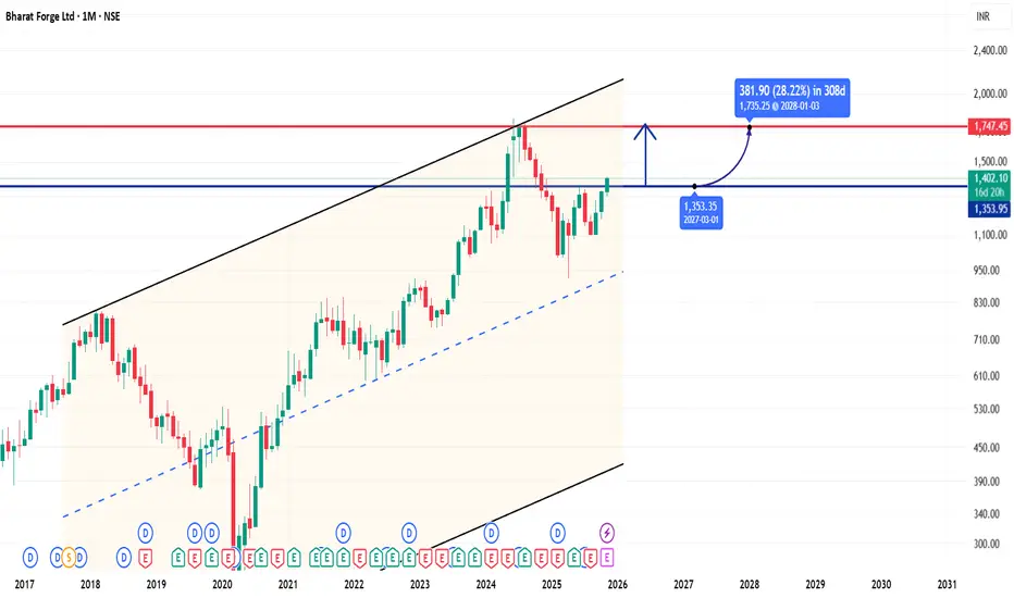 Bharat forge monthly double bottom breakout and weekly bullish and daily good momentum in the uptrend channel. Target is every 100 points with retracement with 50points.