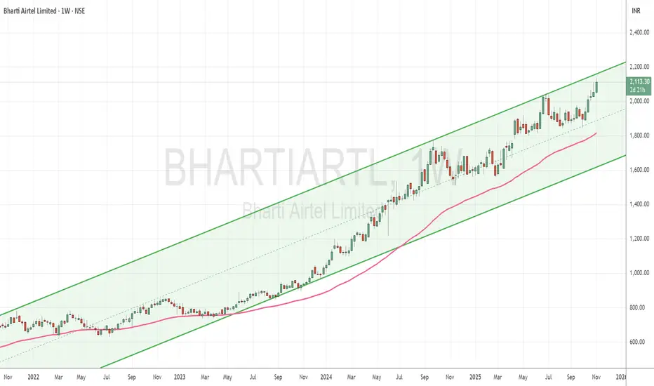 Bharti Airtel is on a strong bull run, maintaining momentum within a defined channel, though overbought conditions hint at a potential correction risk.