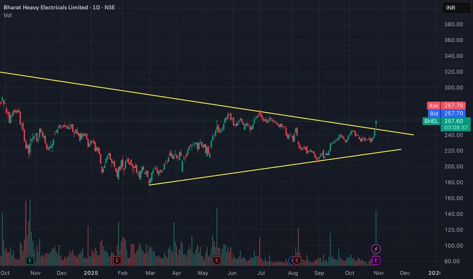 There is a breakout in triangle pattern in BHEL with a strong volume. It is expected to give minimum 5% returns.